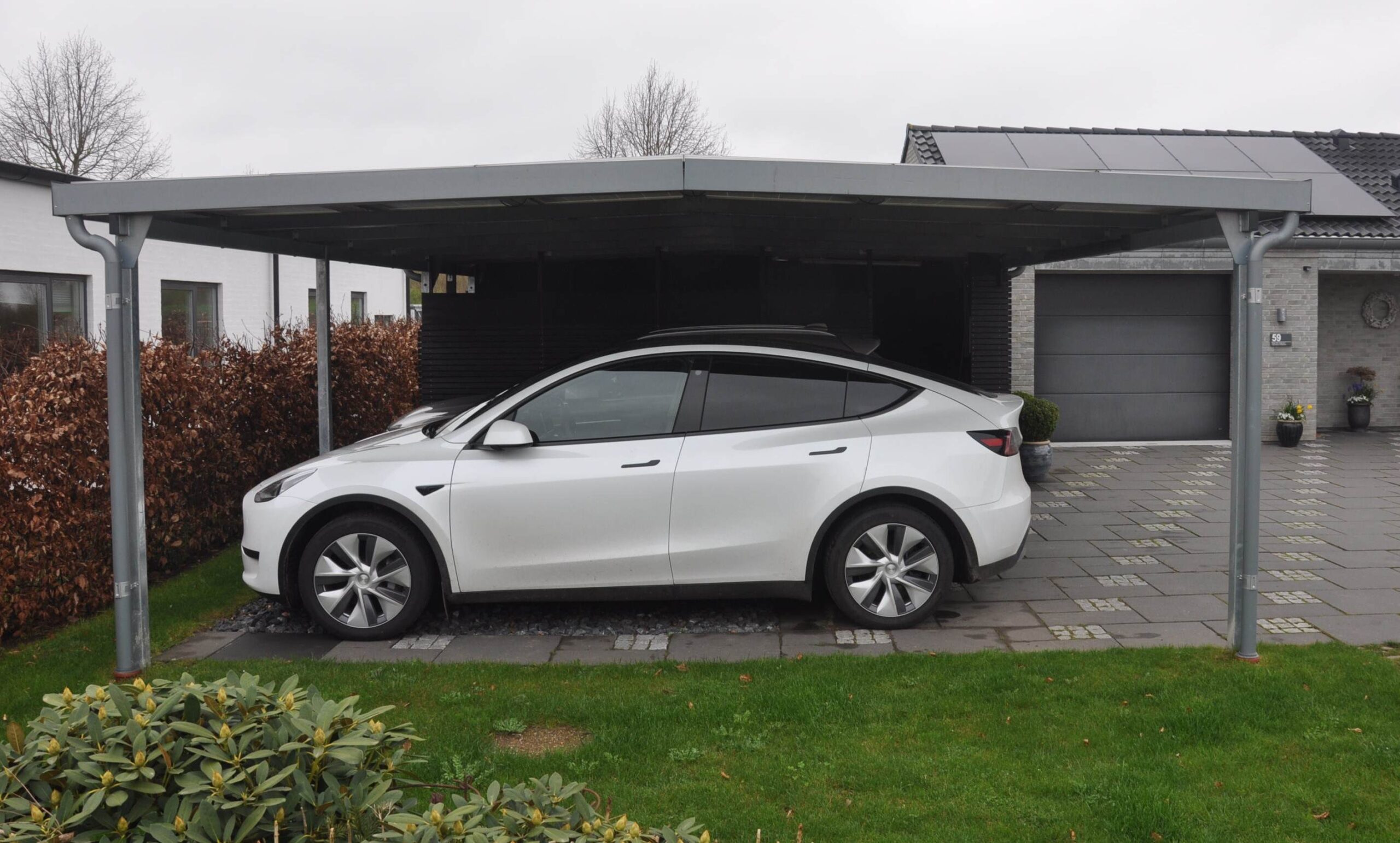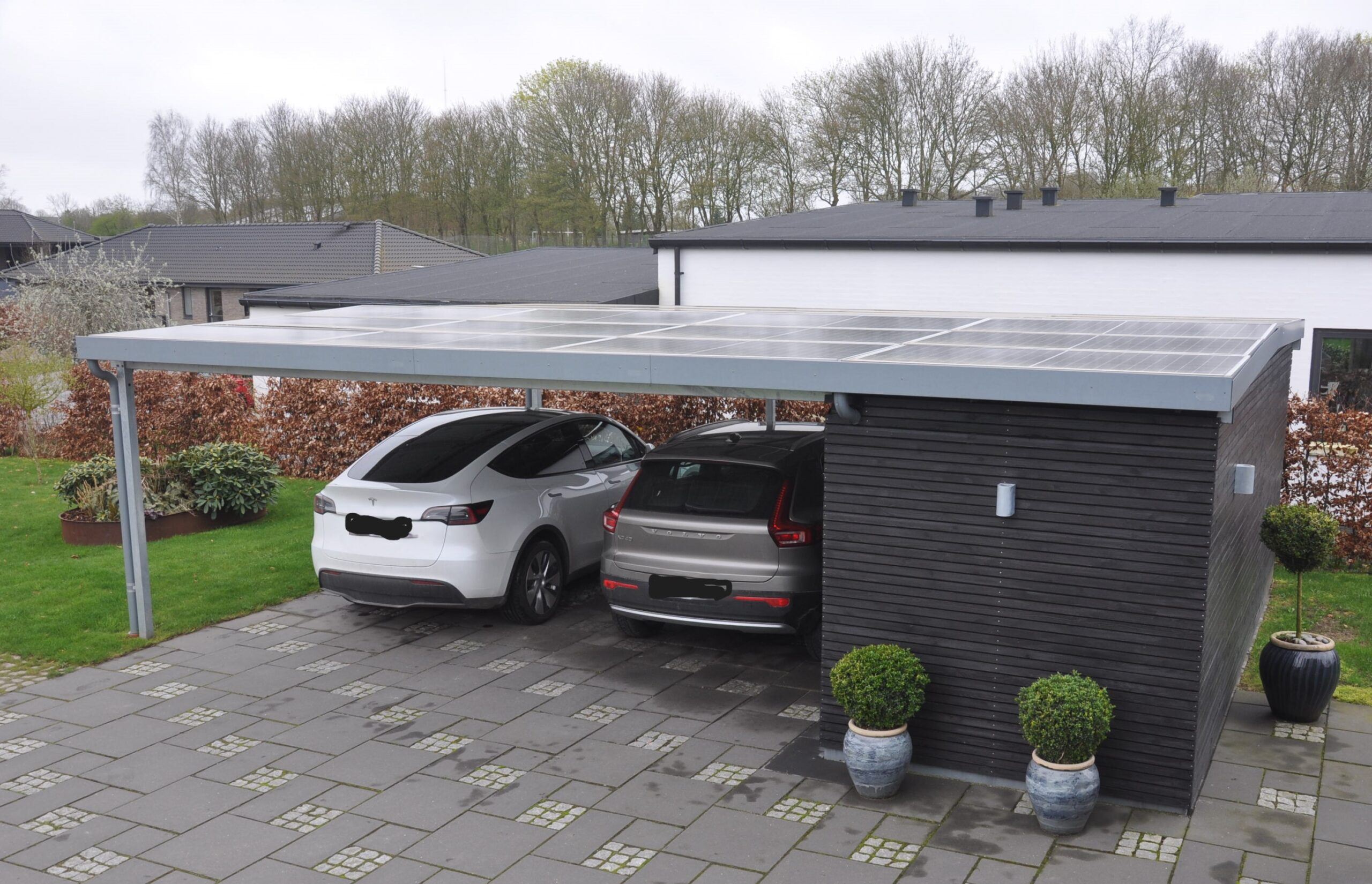 Denne Carport med solceller kan levere strøm til både elbil, husstand og varmepumpe